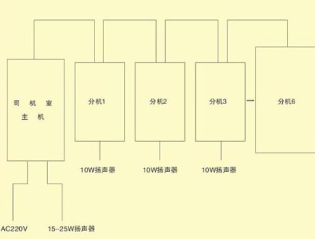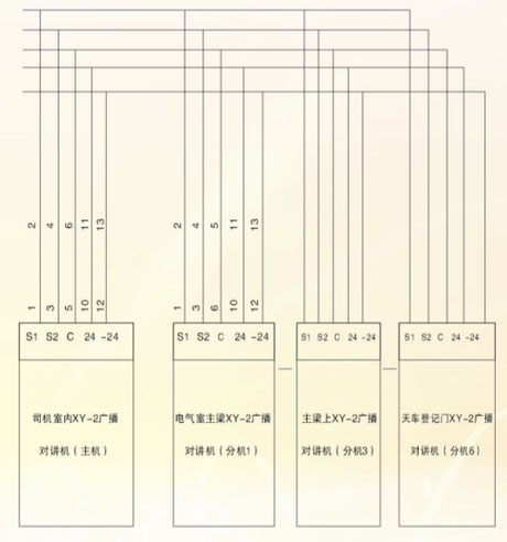 XY―2型系列產(chǎn)品廣泛應(yīng)用于冶金、電力等行業(yè)的有線對(duì)講系統(tǒng),在天車(chē)上其主站安裝在司機(jī)室,分站可以分布在電力室內(nèi)、高壓室、大小車(chē)上和天車(chē)登機(jī)門(mén)。該系統(tǒng)由若干臺(tái)廣播對(duì)講機(jī)組成一個(gè)機(jī)內(nèi)通訊網(wǎng)絡(luò),各個(gè)有線廣播站內(nèi)置揚(yáng)聲器和送受話器,任何一個(gè)廣播站喊話,其余話站均能接通廣播?梢允股a(chǎn)人員方便地與天車(chē)操作人員取得聯(lián)系。在各個(gè)站操作時(shí)無(wú)需撥號(hào),可以方便的實(shí)現(xiàn)一對(duì)一講話,各話站并列接線,用戶(hù)可根據(jù)工藝要求任意擴(kuò)充,每個(gè)話站都是一個(gè)獨(dú)特的系統(tǒng),任一臺(tái)損壞,不會(huì)影響其余分站正常工作。在起重設(shè)備上可以方便地實(shí)現(xiàn)上下車(chē)聯(lián)系,機(jī)內(nèi)操作人員相互通訊。接線原理框圖參見(jiàn)附錄。