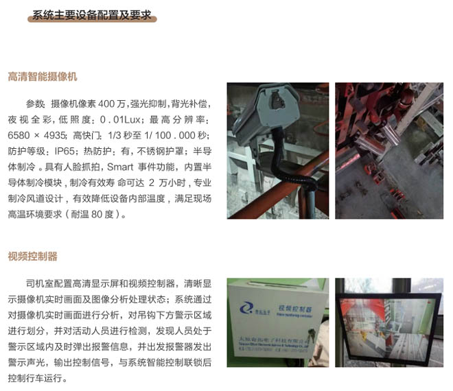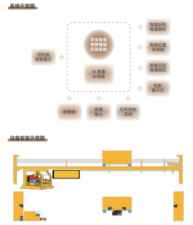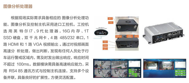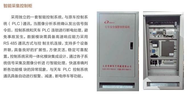 6、行車智控系統(tǒng):控制系統(tǒng)采用一體化模塊集成設(shè)計(jì), 通過各子系統(tǒng)信號(hào)采集及圖像分析進(jìn) 行智能處理,快速準(zhǔn)確判斷各功能模 塊的異常現(xiàn)象,與主機(jī)PLC控制系統(tǒng) 通訊連接具備自動(dòng)進(jìn)行報(bào)警、減速、斷電停車等功能,當(dāng)系統(tǒng)確認(rèn)發(fā)出信號(hào)指令后,控制系統(tǒng)和行車PLC連鎖進(jìn)行斷電處理,避免事故發(fā)生。